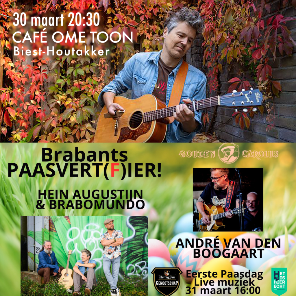 Het belooft een heel bijzonder paasweekeinde worden. Paaszaterdag geef ik een intiem concert in Café Ome Toon in Biest-Houtakker. Het durpke waar ik ben opgegroeid! En eerste paasdag gaan de pannen van het dak in Café de Gouden Carolus in Hilvarenbeek. Een duo-concert met André van den Boogaart.